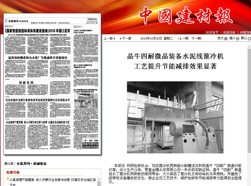 本報訊 利用檢修機會,完成篦冷機兩側部分耐磨澆注料用晶牛“四耐”微晶襯板代替,點火生產以來,贊皇金隅水泥有限公司一年多的實踐證明:晶牛“四耐”微晶延長了篦冷機兩側板的使用壽命,大大降低了篦冷機主傳動電機功率損耗,并避免了經常性設備事故的發生,使企業在工藝技術、維護檢修和節能減排等方面得到全面提升。