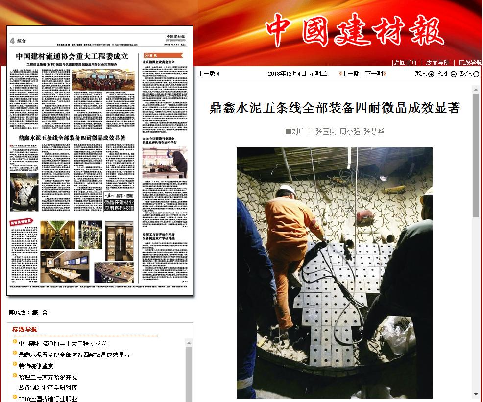 從贊皇金隅水泥公司前期在煙室試用過(guò)晶牛微晶材料的使用結(jié)果來(lái)看,對(duì)遏制水泥窯煙室結(jié)皮的生成效果比較明顯。通過(guò)對(duì)贊皇金隅微晶板試用效果的論證評(píng)價(jià),鼎鑫水泥公司技術(shù)人員認(rèn)為“四耐”微晶新材具有耐高溫、耐腐蝕、耐沖擊、耐磨損、熱穩(wěn)定性好等優(yōu)良性能,非常適合在水泥行業(yè)易結(jié)皮、需耐磨、需高溫的部位應(yīng)用,在煙室高溫、酸堿變化,高低溫變化頻繁的部位尤為合適。尤其是“四耐”微晶新材具有較高的高溫穩(wěn)定性能,在水泥窯煙室高溫、多有害成分的環(huán)境下,材料本身不與煙氣有害成分及生料發(fā)生反應(yīng),使結(jié)皮沒(méi)有穩(wěn)定著床基礎(chǔ),從而不具備自然增厚的條件,微晶材料在水泥窯煙室中使用優(yōu)勢(shì)明顯。