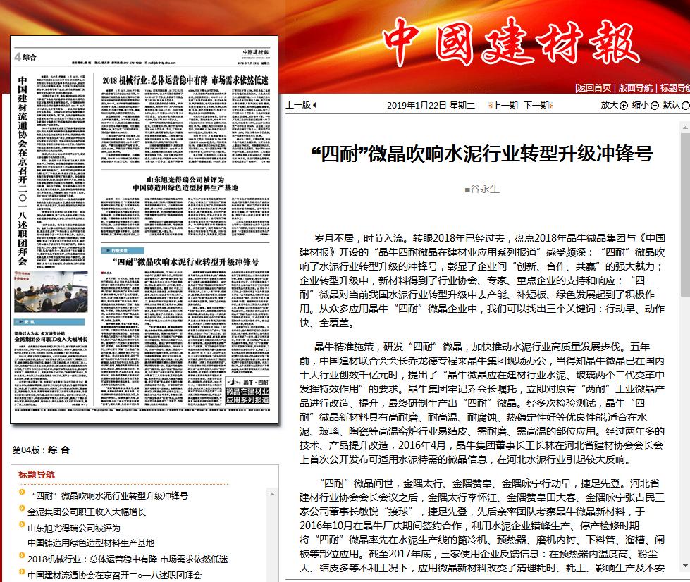 歲月不居,時節入流。轉眼2018年已經過去,盤點2018年晶牛微晶集團與《中國建材報》開設的“晶牛四耐微晶在建材業應用系列報道”感受頗深:“四耐”微晶吹響了水泥行業轉型升級的沖鋒號,彰顯了企業間“創新、合作、共贏”的強大魅力;企業轉型升級中,新材料得到了行業協會、專家、重點企業的支持和響應;“四耐”微晶對當前我國水泥行業轉型升級中去產能、補短板、綠色發展起到了積極作用。從眾多應用晶牛“四耐”微晶企業中,我們可以找出三個關鍵詞:行動早、動作快、全覆蓋。