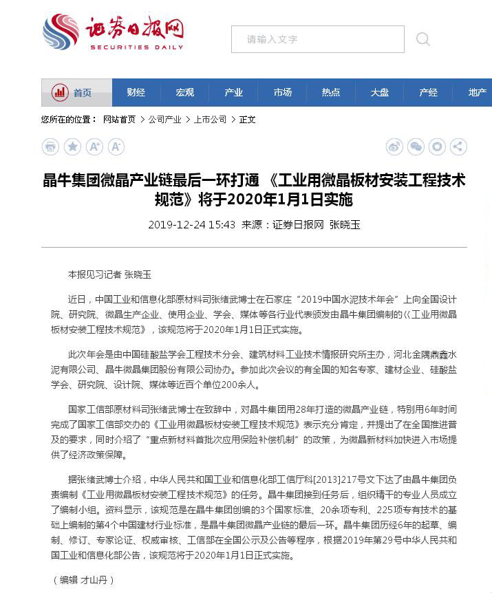 證券日報:晶牛集團微晶產業鏈最后一環打通 《工業用微晶板材安裝工程技術規范》將于2020年1月1日實施