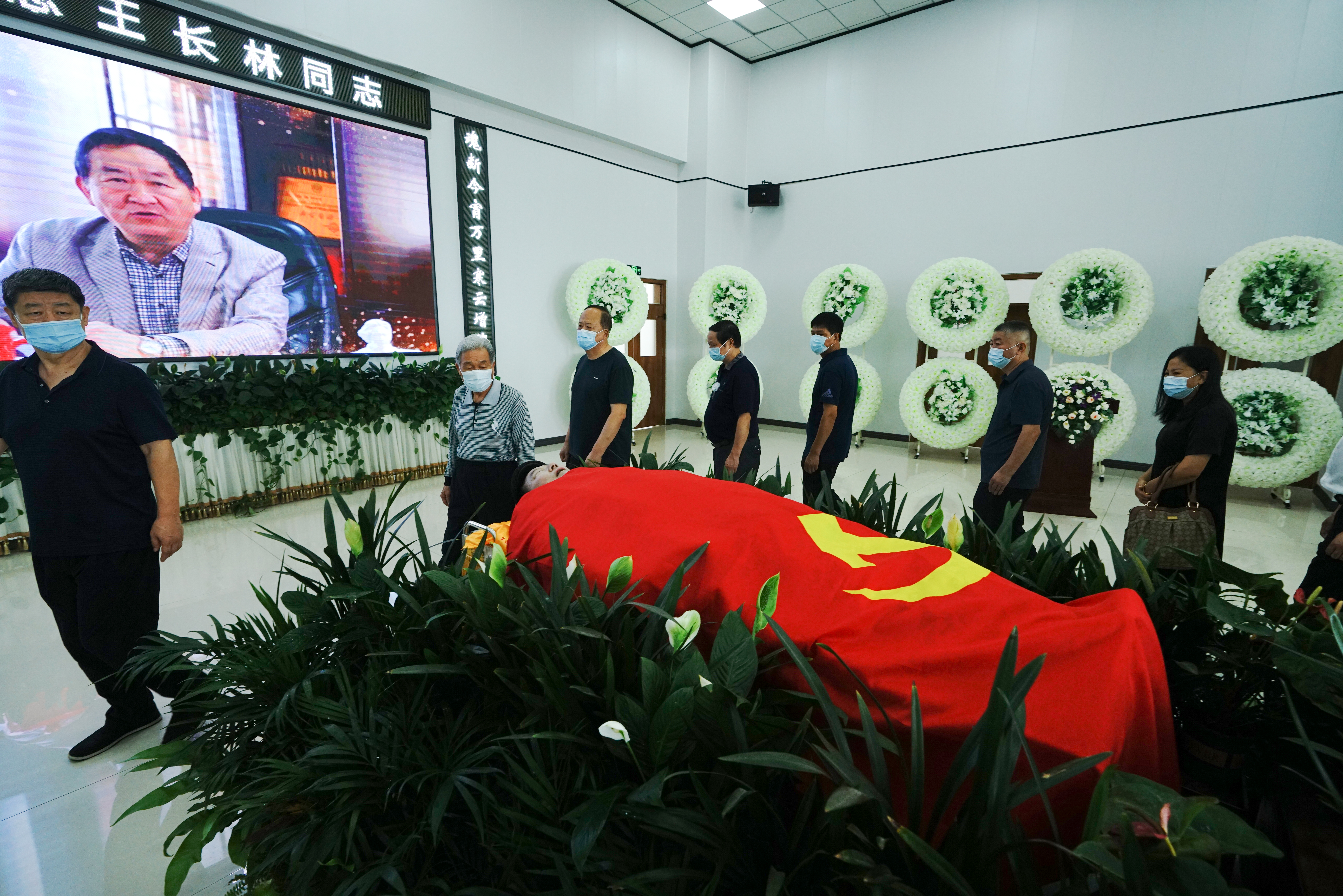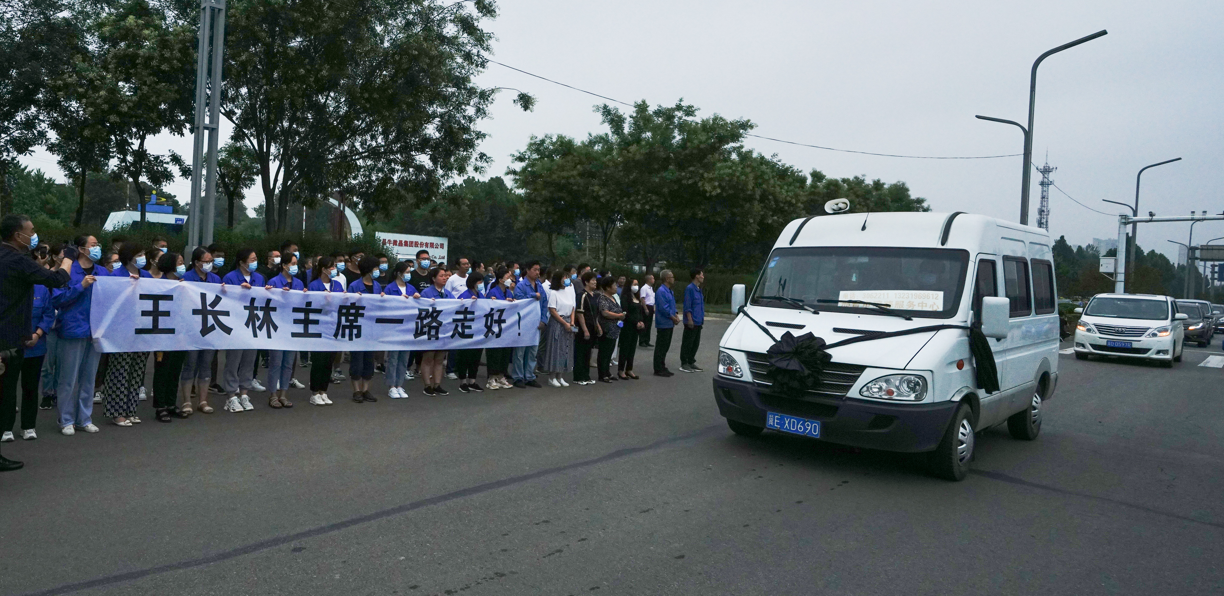 7月5日上午,晶牛集團干部員工打出“王長林主席一路走好!”的挽幛,身著工裝站立在邢州大道晶牛集團總部門口,用音箱反復(fù)播放著企業(yè)之歌《晶牛頌》,灑淚送別敬愛的董事長。9時正,王長林同志的追悼會在河北省邢臺殯儀館馬鞍山公園1號大廳舉行,大廳循環(huán)播放著王長林同志的生前影像,省市各級領(lǐng)導(dǎo),王長林同志的家人、親友、晶牛的干部員工代表等500多人胸前佩戴白花,為王長林的忠魂默哀,抑制不住悲傷情緒失聲痛哭向他作最后告別。王長林同志的遺體上覆蓋著鮮紅的黨旗,躺在鮮花和蒼松翠柏之中,“你終于可以好好歇歇了”人們都在心中默默為他祈禱!